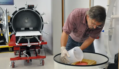 The following day, the chamber is depressurized. Once relieved of pressure, the C clamps are loosened and the mold is removed.